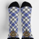 Insignia escudo de Clan Hannay rodeada por una correa y hebilla sobre el fondo tartán. Color de la franja superior del personalizado. texto personalizado en cada calcetín.