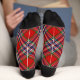 Insignia de escudo del clan MacFarlane rodeada de una correa y hebilla sobre un fondo de tartán rojo. Color de la franja superior del personalizado. texto personalizado en cada calcetín.