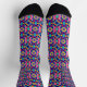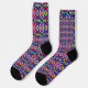 Colorful socks featuring an intricate geometric pattern in vibrant blue, purple, pink, and yellow hues. Black toes and heels provide contrast.