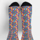 Colorful socks with a jigsaw puzzle pattern in blue, red, yellow, and orange. Black heels and toes contrast vibrantly. Playful and bright design.