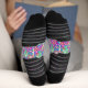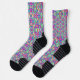Colorful socks with intricate geometric patterns in vibrant purple, green, pink, and blue. Black cuffs, heels, and toes add sharp contrast. Playful, vibrant tone.