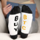 COMPRA BITCOIN SOCKS con logo en un lado de medias y COMPRA BTC en las plantas. Este es un super regalo para cualquier entusiasta.