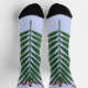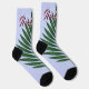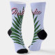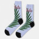 Aesthetic Retro Palm Crew Socks! Customizable, sustainable comfort with a vibrant pink script over a tropical green leaf design on a pastel purple base. Perfect for a vibrant, custom look. Easily change text/add graphics!