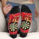 Los jugadores de dardos amarán estos calcetines con patrones temáticos de dardos coloridos. El patrón incluye dianas de dardos, dardos y globos de diálogo estilo cómic con la letra 180 y BULL
