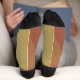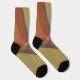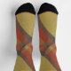Calcetines de disolución. Disolución es un diseño abstracto creado por Anna M. Asbury y consiste en círculos y rectángulos rojos, naranjas, oliva y grises.