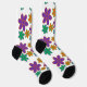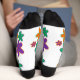 Calcetines blancos gruesos con flores violetas, verdes y naranjas de estilo años 70 sobre ellos.