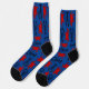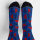 Calcetines estampados de color azul oscuro para hombre o mujer con diseño de langosta y cangrejos. Langostas azules oscuras y cangrejos rojos se arrastran sobre un fondo de color azul real. Los dedos y los talones son negros. Es un regalo divertido para cualquier amante de los mariscos, cocinero de mariscos o hombre de mar.