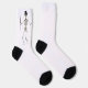 Un elegante esqueleto blanco se ve reflejado en una dinámica pose danzante, con un clásico sombrero de la parte superior negra, una elegante corbata negra y un bastón negro en la mano derecha. La figura está situada en un fondo blanco y crudo, destacando su aspecto depurado y refinado.