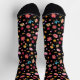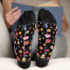 Flores claras y coloridas de diferentes formas y tamaños se reparten en un fondo negro. La disposición crea un ambiente animado y alegre con tonos contrastantes.