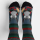 A pair of fun, cute, funny, festive, cosy-up, socks that have a fun winter cartoon donkey doodle illustration on the top and bottom, on a chic, blue grey gradient background, with a striped pattern with a warm colors, on the top.