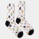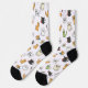 This is a whimsical and charming pattern featuring a variety of adorable cartoon dogs and cats scattered across a clean white background. The pets are illustrated in a simple, hand-drawn style with bright colors and playful expressions, showcasing different breeds and activities (like a cat playing with yarn or a dog wearing a tiny cape). The pattern is shown applied to a pair of crew-length socks with black heels and toes. This design is perfect for animal lovers who enjoy a touch of fun and humor in their apparel.