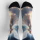 La imagen representa una figura celestial angélica en un entorno paradisíaco. El ángel tiene grandes alas de plumas blancas y está rodeado por un resplandor radiante, con luz que emana de ella y de las nubes circundantes. Tiene un halo ornamentado con una gema azul brillante y lleva un vestido translúcido con acentos dorados. El fondo cuenta con un cielo estrellado nocturno y nubes doradas que reflejan el halo, creando una composición equilibrada. La escena está llena de un resplandor etéreo y de pequeñas orbes brillantes, que le dan un toque místico. Esta representación enfatiza temas de divinidad, luz y gracia.