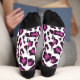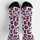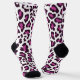 Calcetines con huellas de animales leopardo con manchas de negro y morado caliente sobre blanco.