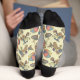 Icono de juguetes de madera conjunto en paleta de color vintage. Tren, bicicleta, trompa, tambor, planicie y bola de playa. Patrón sin foco. Color de fondo personalizado. Color de la franja superior del personalizado. texto personalizado en cada calcetín.