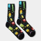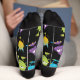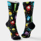 ¡El equipo de divertidos calcetines con fondo negro y muchos monstruos tontos en amarillo, azul, púrpura, rojo y verde!