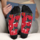 Patrón de higos negros de navidades, perros adorables de pug en trajes festivos con fondo rojo.