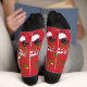 Navidades golosos dachshund perros con abrigos negros, tostados y de manzana vestidos con ropa festiva, sombreros de Santa y suéteres de argyle con un patrón disperso de adornos navideños.