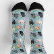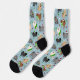Perros de Navidades muy amables vestidos con ropa festiva. Los pomeranianos con abrigos crema, negro, tostado, gris y chocolate llevan sombreros de Santa Claus, cuernos, sudaderas sobre un fondo azul con un patrón de ornamentos dispersos.