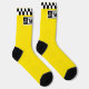 Calcetines amarillos de novedad con una franja de tablero de ajedrez en blanco y negro, y carteles de taxi fuera de servicio. Un regalo divertido para los taxistas.