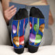 Ornamentos navideños colgando de cintas en un fondo azul oscuro.