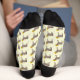 Este impresionante par de calcetines de equipo con estampado presenta un burro marrón pálido con una melena y cola marrones oscuros. El burro está listo para celebrar el Día de los Muertos, el Día de los Muertos. El burro lleva un sombrero mexicano cubierto de estrellas rojas y verdes, zanahorias, remolinos coloridos, cerezas y chiles rojos y verdes. Hay una flor con pétalos naranjas y un centro amarillo en medio del gorra, llamado Tithonia, o girasol mexicano.