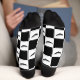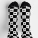 Calcetines con un patrón de damas negrita, negro y blanco que incluye murciélagos. Utilícelos en Halloween o en cualquier otro día del año en que se adapten a tu humor. Simplemente añada un par o dos a tu carrito, llévalos a casa y luego sáquenlos al mundo. Patrón de verificador de Bat Halloween Socks Diseño de vacaciones | ©Melissa Patton - Artista/Ilustrador