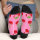Calcetines rosas coloridos adornados con cerezas rojas grandes.