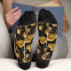 Los brillantes cráneos de oro y los rosas de oro a juego hacen un patrón único y colorido en estos calcetines. Todo se coloca sobre un fondo negro dramático.
