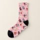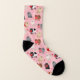 El día de San Valentín dulces Pomeranianos con abrigos de color crema, negro, chocolate, gris y marrón con un punto de polka rojo, rosa y blanco y sudadoras de corazón con huellas de pata dispersas y flecha sobre un fondo rosado.
