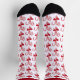 These socks are a sweet treat wrapped in a bow. The pattern is made up of a single image; three red and white, peppermint candy canes. On the top of each sock there is a red band.