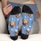 Estas lindas fotos de mascotas azules de flores de maíz o calcetines de fotos de niños tienen dos fotos — de tu mascota o mascotas, hijos, niños o fotos de familia, en un patrón de fila con triángulos blancos, ¡y son los calcetines personalizados perfectos para presentar a tu hijo, esposo, esposa, perro, gato o a cualquiera que amas! ¡Este es el regalo perfecto para el amante del calcetín y un gran Navidad de peluche!