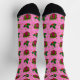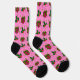Estos calcetines de vacaciones presentan regalos retro de Navidad roja con arcos verdes en un fondo rosado con hojas y bayas huecas.