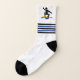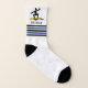 Surfing gifts, surfista su tabla de surf y sus medias de rayas negras y azules con un nombre que muestra un minimalista ícono negro de un surfista parado en su tabla de surf amarilla sobre una ola azul, rayas azules y negras y tu nombre.