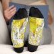 Estos calcetines coloridos presentan un arte fractal simétrico abstracto en amarillo dorado y blanco.