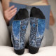 Estos calcetines presentan un intrincado arte fractal en azul oscuro y negro.