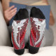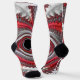 Estos calcetines presentan un hermoso diseño fractal de espiral degradado en rojo, negro, blanco y gris.