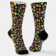 Son los calcetines perfectos para la noche del juego. Estos calcetines de equipo con patrones tienen ilustraciones de dados de juego de rol con dados de 12 lados, 20 lados y 4 lados en colores brillantes contra un fondo negro.