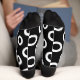 Estos calcetines negros y blancos tienen un patrón de círculo blanco sobre un fondo negro.
