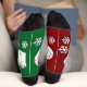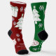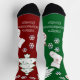 Calcetines de navidades con un diseño original rojo, uno verde. Los calcetines están adornados con obras de arte de árboles de Navidad, medias, ornamentos y regalos. El arte está rodeado de copos de nieve, con un espacio para los nombres o un mensaje personalizado en cada calcetín. Message MineByDesign para obtener ayuda con este diseño o cualquier otro diseño que usted visualice.
