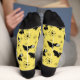 Estos calcetines divertidos son perfectos para los bailarines del grifo y los instructores de baile. Presentan un patrón de zapatos de punteo en negro y gris con formas de estallido negro o asterisco colocados sobre un fondo dorado amarillo soleado.