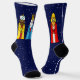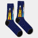 Tres hombres sabios con ropas coloridas sosteniendo regalos y pequeños copos de nieve en calcetines azul marino. Feliz Navidad!