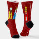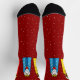 Tres hombres sabios con ropa de colores sosteniendo regalos y pequeños copos de nieve en calcetines rojos. Feliz Navidad!