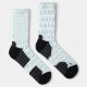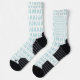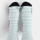 White knee-high socks with blue oval patterns, featuring black toes, heels, and tops. "L" and "R" labels mark the respective socks.