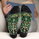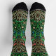 Socks in a vintage William Morris Jacobean floral wallpaper pattern of coral pink tulips, yellow daisies, blue violets, delicate white blossoms, and jade green foliage, on a black background, digitally enhanced and colored