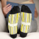 Slightly wobbly stripes in yellow on white. Uneven, as if hand-drawn. Suitable for the office or other serious business activities. At least as long as you keep your shoes on. Underneath, at the foot, there's still some space, where you can add your name or a short quote that brightens your day.