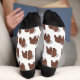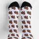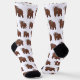 A brown woolly mammoth looks at the viewer. Has raised tusks, hairy coat, small eyes and ear and a large long trunk.