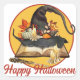 Calcomanía cuadrada temática de Halloween con una ilustración de un sombrero de bruja decorado sobre un libro de hechizos con velas derretidas y varita, el texto personalizable "Feliz Halloween" puede quedar como está o cambiarse con un toque personalizado.