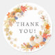 Hermosa etiqueta de agradecimiento de ducha de novia con una corona de hojas de otoño con calabazas.