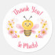 Una linda abeja bumblebee rosa y amarilla con flores con las palabras, Muchas gracias decora esta calcomanía.