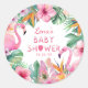 Sella tus favores con un toque tropical usando esta pegatina de baby shower de flamenco. Con florales acuarela exuberantes, hojas de palmera vibrantes y un par de flamencos rosados juguetones, esta pegatina redonda es perfecta para bolsas, cajas o sellos de sobres. Personalízala con el nombre de la homenajeada y la fecha de la celebración para completar tu fiesta de verano o tema luau.